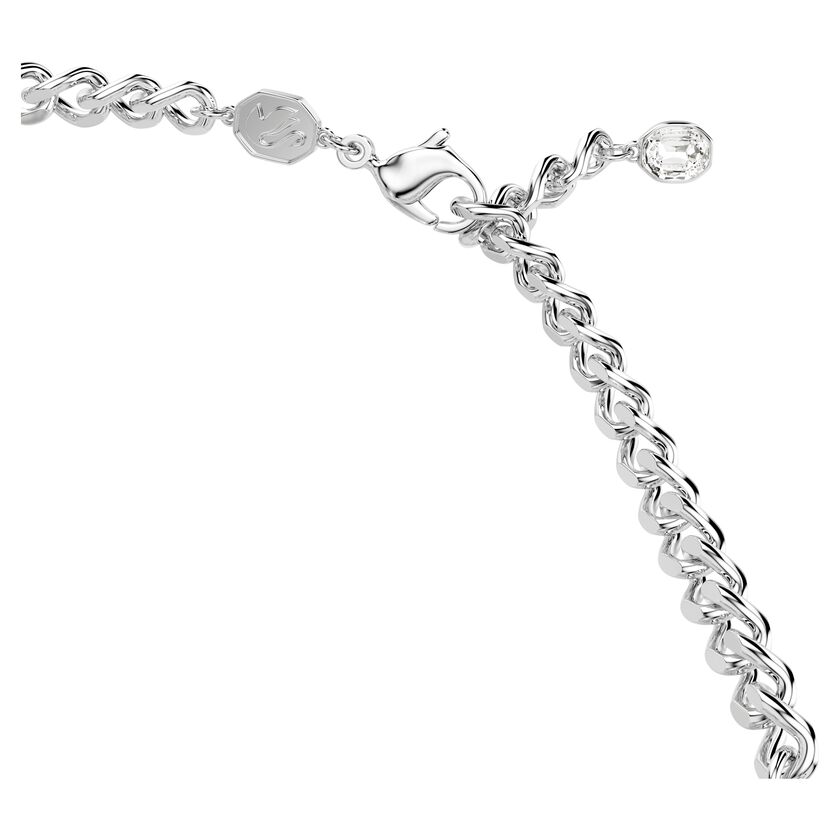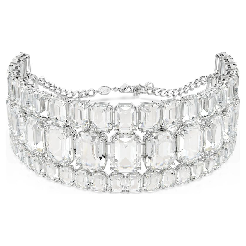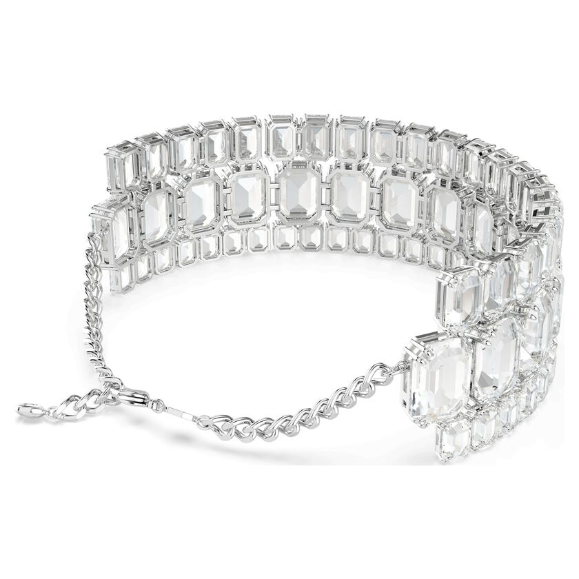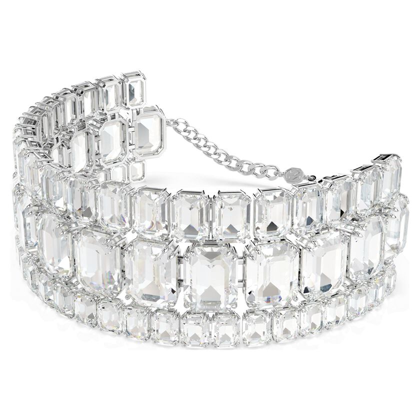 عززي أناقتك اليومية مع عقد شوكر الرائع من عائلة Millenia. قطعة مميزة براقة بتصميم مطلي بالروديوم مرصع بثلاثة صفوف من أحجار الكريستال الشفافة ذات القطع المثمن بأحجام مختلفة. يُعد هذا التصميم اللافت للنظر خياراً مثالياً للملابس الصباحية والمسائية ومثالاً رائعاً على براعة سواروفسكي في التلاعب بالضوء.
