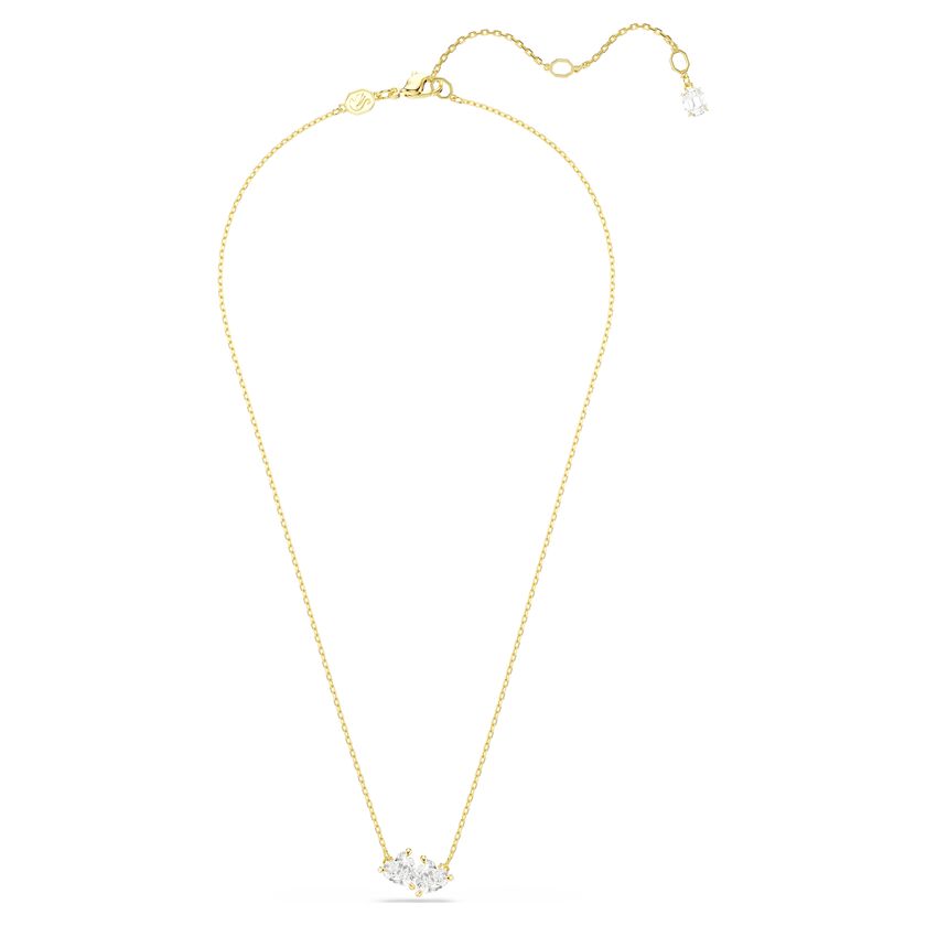يجمع هذا العقد من عائلة Mesmera من سواروفسكي بين التصميم الكلاسيكي واللمسة العصرية. يزدان التصميم بأحجار زركونيا سواروفسكي على شكل قلبين متماثلين ويتألق بطلاء باللون الذهبي وسلسلة تفيض بالأناقة الهادئة. قدِّمي هذا العقد الساحر هدية مثالية ورومانسية لأحبائك.